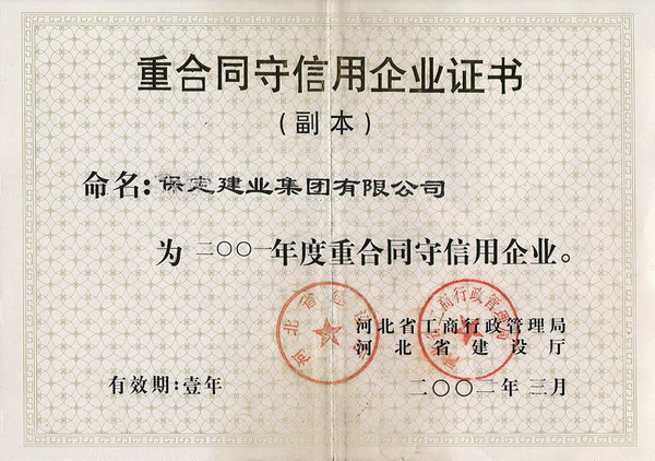 01年度省重合同守信用企業(yè)證書