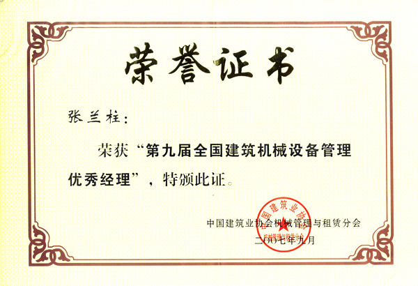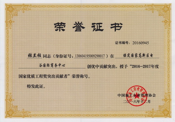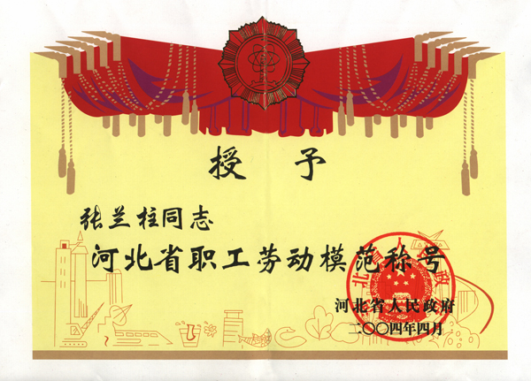 張?zhí)m柱同志以他杰出的工作業(yè)績被各級領導機關授予:全國、河北省、保定市建筑業(yè)優(yōu)秀企業(yè)經理;優(yōu)秀企業(yè)家;優(yōu)秀共產黨員;優(yōu)秀黨務工作者;優(yōu)秀思想政治工作者;安全生產、工程質量管理先進個人;河北省優(yōu)秀經理管理者;河北省建設系統勞動模范;河北省勞動模范等榮譽稱號
